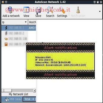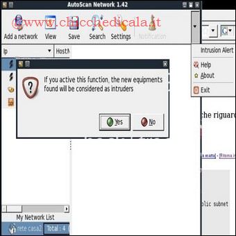| 13. Un’utile funzionalità di AutoScan è quella che permette di rilevare eventuali computer esterni che tentano di accedere alla rete locale. Attiviamola dall’interfaccia principale del software cliccando su Intrusion Alert e confermando con Yes. 14. Se viene rilevato un nuovo computer nella nostra LAN, AutoScan ci avverte con un messaggio in cui viene indicato anche l’Adresse Mac, l’indirizzo fisico della scheda di rete che può essere utilizzato per bloccare il computer intruso a livello di router. | ||