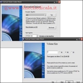 | 3. Fate ancora una volta clic su Next. Nella schermata che vedete in figura, potete scegliere il nome del file da creare. Facendo clic sul pulsante Select file, apparirà la consueta finestra di navigazione, e potrete selezionare in quale cartella creare il file. Attenzione, però: se sceglierete un file già esistente, questo verrà cancellato e sostituito dal file criptato. Digitate quindi un nome appropriato per il file. Specificate pure una finta estensione (per esempio .jpg): servirà a mimetizzare il file tra gli altri. Fate clic su Next. 4. La finestra successiva consente di scegliere tra vari algoritmi di crittografia, ma noi manterremo l’AES usato di default. Fate clic su Next. Successivamente dovrete specificare le dimensioni del file da creare. Digitate la cifra nella casella, espressa in Kb, Mb o Gb. Nella finestra è riportato lo spazio disponibile sul drive scelto, che ovviamente non può essere ecceduto. Scegliete la dimensione del file, in base alla quantità di materiale che volete occultare al suo interno. Fate ancora clic su Next. | ||
