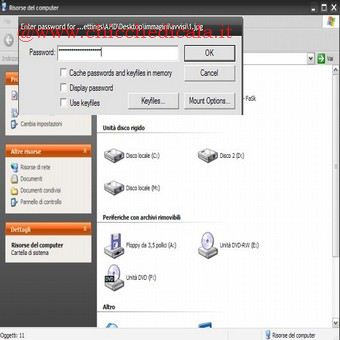 | 7. Nella finestra che si aprirà, digitate all’interno della casella la password che avete scelto in precedenza, e fate clic su OK. A questo punto, controllate all’interno delle Risorse del computer. Sarà apparso un nuovo drive, corrispondente al contenuto del file crittografato. Ora potrete trasferirvi file dentro e fuori, come se fosse un normalissimo disco del vostro computer. 8. Una volta terminate le operazioni, per rendere i vostri dati di nuovo inaccessibili tornate alla finestra di TrueCrypt, selezionate con un clic il drive in questione e fate clic sul pulsante Dismount. Il drive scomparirà, e sarà impossibile accedere al contenuto del file per chi non ha la parola d’ordine. | ||