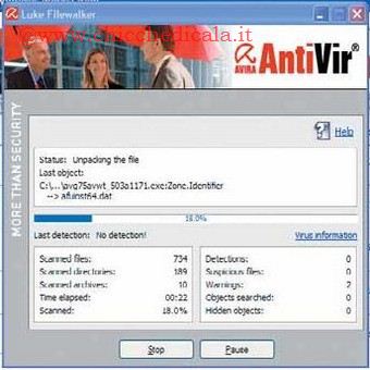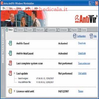 | Dopo aver visto come ottenere una licenza gratuita, analizziamo Avira Antivir Free. Il kit di sicurezza si basa, standard ormai consolidato per pressoché tutti quanti questi pacchetti, sia su un motore euristico, sia su un sistema a librerie (sempre aggiornatissime). Caratterizzato oltretutto da un prezzo modesto, rappresenta più che altro un “combo” di diversi ambienti paralleli: accanto allo scanner antivirus, è previsto un sistema di difesa contro lo spyware, i dialer, il malware proveniente dalla posta elettronica e il phishing. |
