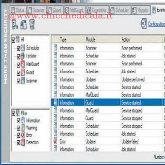 | 11. Selezionate Events. Troverete, in questa pagina, un elenco di tutti gli eventi significativi gestiti dal sistema. Anche in questo caso, attraverso un doppio clic su una riga, è possibile ordinare i particolari dell’evento stesso. Da notare (accanto alla scritta More than security) la possibilità di esportare l’intera struttura della scansione: opzione utile se si sottopone al servizio di help una situazione particolarmente complessa. | 12. molti contagi virus non possono essere risolti con funzionalità di riparazione e rimozione interni al programma, ma vanno eliminati mediante un strumento di rimozione virus e malware separato, appositamente progettato per determinati contagi virus. Avira mette a disposizione dei suoi clienti e di tutti gli interessati un apposito strumento di rimozione per virus e malware. (vedi) | |