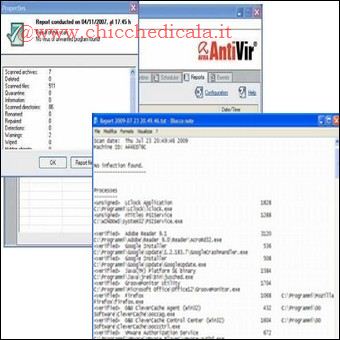 | 9. Scegliete Reports: si apre una finestra che riassume le azioni svolte in ordine cronologico. Premete “Configuration” e, nella finestra, stabilite il numero massimo e il tempo di conservazione dei report generati. Selezionate la seconda opzione e chiudete. Di ogni report presente nella pagina principale, è possibile vederne le caratteristiche, anche dettagliatamente. | 10. Per fare ciò, una volta scelto il log da analizzare,premere Report file. Si apre una finestra di testo, dove sono presenti i dati caratteristici dell’installazione, le specifiche del report, la tipologia della scansione, il numero e il tipo di file analizzati, i risultati e le statistiche. | |
