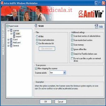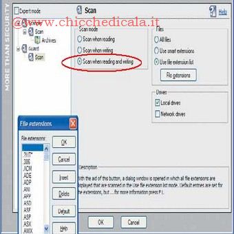 | 3. Passare all’altra voce del menu, Guard, e \tselezionate, nell’elenco a sinistra, la voce Scan when reading and writing. Passate al menu a destra e selezionate Use file extensions list. Fate clic il pulsante File extensions e troverete l’elenco delle estensioni “pericolose”. Potrete aggiungerne altre, o eliminarne alcune. | 4. Avviate la scansione del sistema. Il programma mostra una \tfinestra con i parametri e l’avanzamento dell’operazione. In caso di infezione rilevata, è visualizzato un messaggio d’avviso, con l’eventuale richiesta di intervento dell’utente, se necessario. Virus information evidenzia le forme e i tipi di malware da cui si è protetti. | |