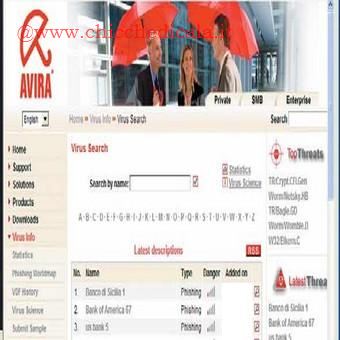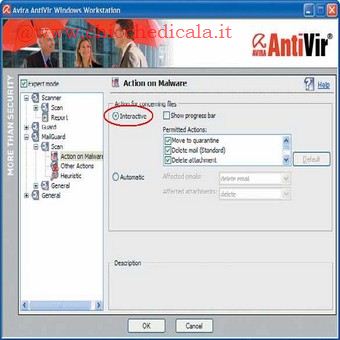 | 5. Vale la pena esplorare meglio questo ambiente: si tratta di una vera e propria enciclopedia virale, in cui sono elencati gli agenti e i loro effetti. L’aggiornamento è giornaliero, ed è possibile ricavarne informazioni interessanti, tra cui anche una mappa mondiale dei virus aggiornata. Attraverso questa pagina è possibile sottoporre ai laboratori Avira elementi sospetti. | 6. Passate all’ambiente delle e-mail. La verifica riguarda ogni client POP3, non solo i programmi della famiglia Outlook. Scegliete Action on malware e, a destra, selezionate la voce Interactive, per garantire il controllo su ogni azione. L’altra opzione (Automatic) è certamente più comoda, ma è anche più rischiosa. Scegliendo General è possibile definire eccezioni alle regole. | |