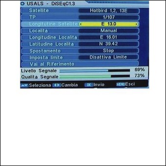 | 3. Prepariamo due spezzoni di cavo per collegare l’LNB al rotore e il rotore al decoder. Accendiamo il TV e tramite SCART colleghiamolo al decoder. Accediamo al menu Installazione/Scansione Transponder del decoder e spostiamo lentamente la parabola. Quando Livello e Qualità superano il 70% possiamo fermarci e stringere bene tutti i bulloni. | 4. Dal telecomando del decoder accediamo alle sue impostazioni dal pulsante Menu. Da Impostazioni Antenna disabilitiamo il DiSEqC; spostiamoci su Posizionatore e scegliamo USALS. Confermiamo con Ok. Nella schermata successiva inseriamo i valori longitudine e latitudine della nostra località annotati in precedenza. | |