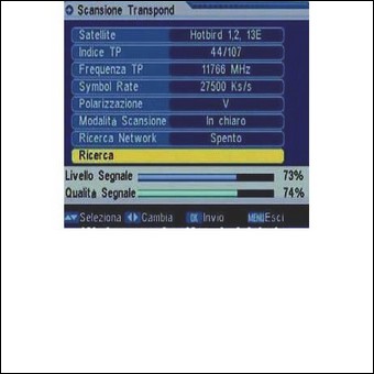 | 5. Evitiamo di selezionare la voce Vai al Riferimento.Pigiamo il tasto Menu sul telecomando per confermare le impostazioni e uscire dal menu. A questo punto, il rotore in automatico si andrà a posizionare al punto zero. Per verificare ciò, portiamoci vicino alla parabola e controlliamo che l’indicatore posto sotto il rotore coincida con lo 0. | 6. Confermate le impostazioni dell’antenna passiamo alla voce Scansione Transponder,lasciamo le impostazioni standard eccetto che per la voce Modalità Scansione dove sceglieremo In Chiaro, così da trovare solo i canali free. Portiamoci sull’ultimo campo Ricerca e confermiamo con Ok per avviare la ricerca. | |