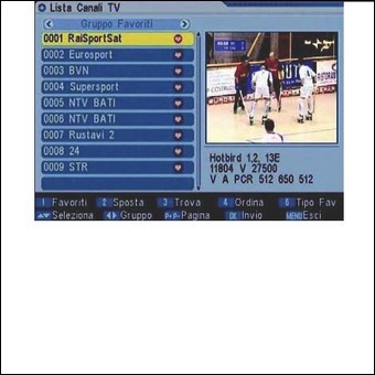 | 7. Aggiungiamo altri canali oltre a quelli “standard” che tutti vediamo con Hotbird 13E; da Scansione Transponder selezioniamo un altro satellite dal campo Satellite, ad esempio Hellas Sat 39E; conviene cercare solo canali in chiaro. Avviamo la Ricerca; la parabola si muoverà in automatico alla ricerca di nuove emittenti! | 8. Una volta terminata la scansione avremo centinaia di nuovi canali pronti da visionare. Per fare una scrematura ricorriamo alla funzione Preferiti. Quando troviamo un canale interessante sarà sufficiente premere il tasto 1 (o qualc’osa di simile) del telecomando per aggiungerlo ai Preferiti. Per richiamarli basta premere il tasto rosso del telecomando. | |