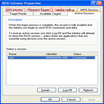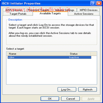 | 6. Premiamo su OK. Nella sezione Target portals (all’interno del tab Discovery) vedremo l’indirizzo IP appena immesso. Apriamo il tab Targets (o available targets). Tra le voci presenti, leggeremo anche il nome del masterizzatore condiviso. Clicchiamo su Log On e diamo OK quando richiesto. | 7. Se abbiamo compiuto tutto a dovere, all’interno della schermata precedente dovrebbe comparire il valore Connected nella colonna Status in corrispondenza del masterizzatore condiviso. Non resta altro da fare che premere OK e iniziare a sfruttare la nostra nuova unità “virtuale”. | |