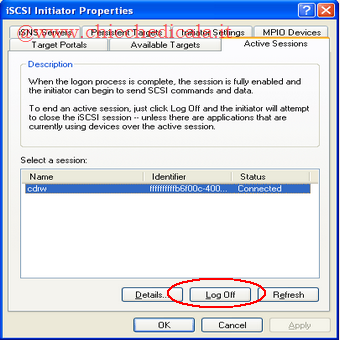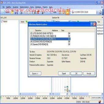 | 8. Chiediamo all’utente del PC su cui è installato il masterizzatore d’inserire un DVD vergine nell’unità e avviamo Nero Burning sul nostro computer. Clicchiamo su Masterizzatore/Seleziona Masterizzatore, evidenziamo il “nuovo” masterizzatore, diamo OK e procediamo come al solito con la scrittura del disco. | 9. Al termine, per disconnetterci dal masterizzatore, avviamo iSCSI Initiator come fatto in precedenza e apriamo la scheda Targets. Selezioniamo quindi la voce e premiamo su Details. Mettiamo la spunta accanto all’unica riga sotto Identifier e premiamo su Log Off. | |
