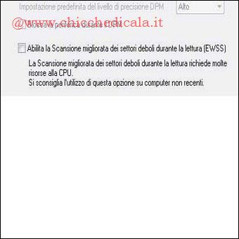| 1. Dal riquadro Opzioni, sulla sinistra, fate clic sulla prima voce, Generali, quindi nella finestra che si apre spostatevi alla scheda Lettura. La prima voce dovrebbe rimanere sempre selezionata, perché abilita il controllo dell’integrità dei dati. Le impostazioni della Scansione avanzata dei settori riguardano le protezioni che fanno uso di finti errori sul disco originale è possibile indicare quale sia la soglia oltre la quale il programma deve capire di essere di fronte a errori fasulli. 2. Le altre opzioni riguardanti la lettura sono inerenti il DPM (lo studio della posizione precisa dei dati su disco) e l’abilitazione dell’EWSS, una scansione più accurata dei settori durante la lettura. Quest’ultima opzione andrebbe attivata solo se si nota che il lettore sta facendo fatica a leggere il disco, magari anche solo perché l’originale comincia a mostrare i segni del tempo. | ||