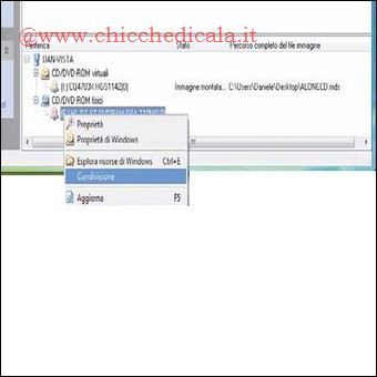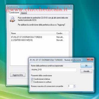 | 5. Per concludere, anche se non si tratta propriamente di una delle possibili configurazioni di Alcohol 120%, vi mostriamo un’altra delle possibilità del programma: quella di condividere in rete i lettori CD virtuali. Al momento dell’installazione, è possibile selezionare tra i componenti del programma un elemento chiamato Server iSCSI, che ha proprio lo scopo di attivare tale funzione. Per condividere un’unità virtuale, dalla finestra principale di Alcohol dovete fare clic con il tasto destro sull’icona del lettore, e selezionare la voce Condivisione. 6. Nella finestrella che si apre bisogna selezionare l’unità da condividere. L’elenco sarà probabilmente composto da due unità, una reale e una simulata da Alcohol. Fatto clic sul pulsante Aggiungi, non resta che indicare il nome della periferica, così come sarà vista dagli altri computer della rete, e alcune semplici opzioni: se abilitare lettura e scrittura e il numero massimo di utenti che potranno accedere contemporaneamente alla risorsa. Basta premere OK e il gioco è fatto. | ||