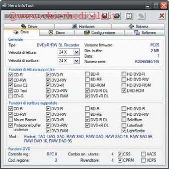 | 1. Per creare un disco LightScribe o LabelFlash è necessario avere un masterizzatore predisposto, dei dischi compatibili con la tecnologia utilizzata e, non ultimo, di un software in grado di pilotare l’intero processo. Ora vedremo come utilizzare la versione di Nero Cover Designer inclusa nella suite Nero Premium, per capire se il masterizzatore in vostro possesso vi consente la scrittura tramite LightScribe o LabelFlash potete usare il programma di diagnostica Nero InfoTool (in figura) oppure controllare se sul cassetto del masterizzatore sia presente il logo di una delle due tecnologie. 2. Il masterizzatore in mio possesso supporta la tecnologia LightScribe, e Nero Cover Designer (lo strumento di disegno della suite) ci presenta immediatamente questa scelta, con diversi modelli disponibili. I modelli sono tutti piuttosto spartani, rispetto a quelli di cui si dispone in caso di una normale stampa su carta: questo perché la stampa con LightScribe (così come con LabelFlash) consente di lavorare esclusivamente su tonalità di grigio, e sono quindi consigliabili motivi geometrici e scritte, non troppo elaborati graficamente. | ||