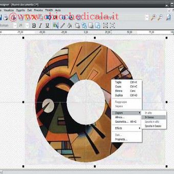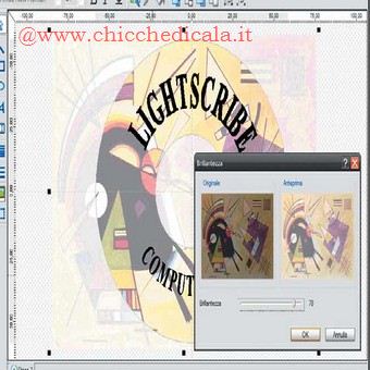 | 3. Se volete inserire un’immagine di sfondo, dovete avere qualche accortezza. Nel mio caso ho scelto un dipinto di Vasilij Kandinskij. Fate clic sul pulsante di inserimento delle immagini e nella finestra che si apre selezionate il file desiderato. Posizionate con il mouse l’immagine nel punto dove la desiderate ed eventualmente ridimensionatela trascinando i bordi. Se l’immagine ha “coperto” parte del testo, come nel mio caso, fate clic con il tasto destro su di essa, selezionate la voce Disponi e quindi la voce “In basso”. In questo modo l’immagine viene posizionata idealmente dietro le scritte, che tornano visibili. L’immagine è però ancora troppo forte, una stampa monocromatica di questa pagina sarebbepraticamente illeggibile, ma nero offre semplici filtri per situazioni come questa. 4. Fate nuovamente clic sull’immagine con il tasto destro del mouse, selezionate il menu Effetti, quindi Regola e infine il comando Contrasto. A questo punto potete dare un nuovovalore al contrasto dell’immagine: muovete l’indicatore con il mouse fino a raggiungere (quasi completamente a sinistra) un valore tra -75 e -90 (attenti al valore negativo!). Quindi fate clic nuovamente sull’immagine, aprite lo stesso menu Effetti e il sottomenu Regola, e passate al comando Luminosità. Il nuovo valore deve essere compreso tra 75 e 90 (senza segno meno). L’immagine dovrebbe ora essere pronta alla stampa; se volete avere un’idea del risultato finale, nel menu File potete utilizzare il comando Anteprima di stampa LightScribe, che vi mostra essenzialmente l’immagine trasformata nella sua versione monocromatica. E ricordate che per stampare con LightScribe dovete inserire nel masterizzatore il CD capovolto, in modo che la faccia superiore possa essere colpita e incisa dal laser. | ||