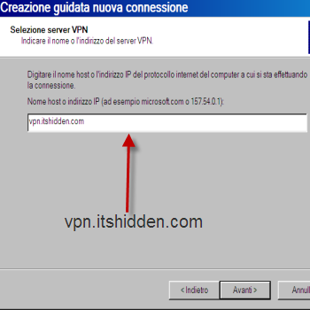 Creazione VPN 5: Inseiramo la stringa “vpn.itshidden.com” \t\te clicchiamo Avanti. |