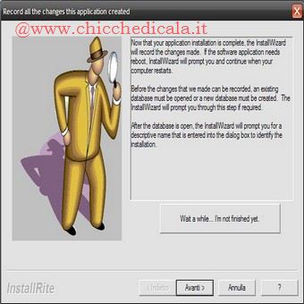 | 3. Possiamo ora indicare ad InstallRite il file di seput de programma che vogliamo installare e del quale desideriamo tracciare eventuali modifiche. Clicchiamo sul pulsante accanto alla voce Installation Program To Run selezioniamo il programma da monitorare (ad esempio winrar) e clicchiamo su Apri. Avviamo l’installazione con Avanti. | 4. Installato il programma, apparirà la finestra di InstallRite. Clicchiamo su Wait a While..I’m not Finisched Yet e selezioniamo Indefinite. InstallRite sarà eseguito in Background, configuriamo il software appena installato. Clicchiamo poi sull’icona di InstallRite nella Systray, scegliamo Restore, quindi clicchiamo su SI. | |