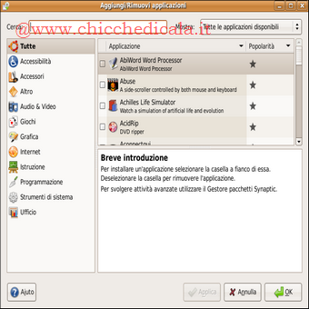 | Ubuntu ci offre un pannello grazie al quale effettuare nuove installazioni sarà davvero semplicissimo. Per scoprirlo andiamo nel menu Applicazioni > Aggiungi/Rimuovi. Il pannello Aggiungi/Rimuovi ci mostra una lista di applicazioni selezionate dal team di Ubuntu. Potremo scegliere programmi per fare grafica, per creare musica, per l’ufficio e molti altri! Supponiamo di volere installare un programma per masterizzare? Niente di più facile! Selezioniamo il menu Audio e Video, spostiamoci nella colonna di destra e cerchiamo K3b, quindi spuntiamo il piccolo quadrato corrispondente al programma. Ora clicchiamo Applica modifiche e, quando richiesta, digitiamo la nostra password. Dopo pochi istanti il sistema inizierà a scaricare il pacchetto da Internet e successivamente lo installerà. Infine, potremo ritrovare il programma installato nel menu suggerito: in questo caso Applicazioni > Audio e video > K3b! In modo analogo, avremmo potuto cercare il programma utilizzando la funzione Cerca. Ma se avessimo voluto disinstallare un programma? Dal pannello Aggiungi/Rimuovi cerchiamo il programma nella lista delle applicazioni e togliamo il segno di spunta dal quadrato corrispondente. Clicchiamo Applica modifiche e in pochi istanti l’applicazione verrà disinstallata! PER APPROFONDIRE | ||