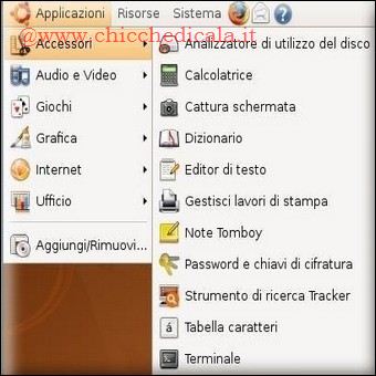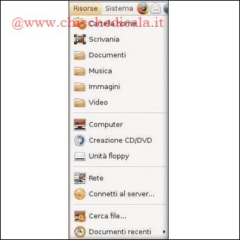 | Il menu Applicazioni: Il menu Applicazioni mostra i programmi installati nel Desktop. In questo menu abbiamo le voci Accessori, Audio e Video, Giochi, Grafica, Internet e Ufficio. È da questo menu che possiamo avviare programmi per fare grafica, ascoltare musica o lavorare con applicazioni per l’ufficio: le applicazioni di OpenOffice.org ad esempio le troviamo nel menu Ufficio. L’ultima voce presente nel menu Applicazioni èAggiungi/Rimuovi: questa aprirà un pannello grazie al quale potremo installare o disinstallare con un semplice clic molto altro software! Il menu Risorse: Il menu Risorse ci offre tutto quanto possa servire per la gestione di file e cartelle, in locale o in rete. Le prime voci – Cartella home, Scrivania, Documenti, Musica, Immagini, Video – sono in realtà semplici cartelle alle quali si accede tramite il programma Nautilus. Scorrendo il menu, troviamo la voce Rete, utile allorché si debbano gestire file in rete. La voce Connetti al server sarà utile invece per creare connessioni Ftp, SSH ed altre. Infine, abbiamo le voci Cerca file e Documenti recenti, spesso indispensabili nella gestione quotidiana dei file. | ||