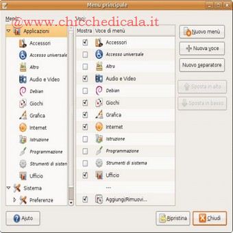 | Il menu Sistema: Il menu Sistema si divide fondamentalmente in due voci distinte: Preferenze e Amministrazione. Il menu Preferenze è ricco di strumenti per personalizzare il nostro sistema. Scorrendo alcune voci, abbiamo la possibilità di cambiare la Risoluzione schermo, impostare un nuovo Tema per il Desktop, abilitare nuove scorciatoie da tastiera con la voce Tastiera e molto altro. Il menu Amministrazione offre invece strumenti più dediti alla gestione e amministrazione del sistema: da qui ad esempio potremo installare software con il Gestore pacchetti Synaptic, (continua>) creare e definire i permessi per un nuovo utente con Utenti e gruppi, verificare la funzionalità della nostra rete con Strumenti di rete, avere un quadro completo del nostro sistema con Monitor di sistema e molte altro. Personalizzare i menu: È bene sapere che ognuno di questi menu è personalizzabile. Se infatti andiamo in Sistema > Preferenze> Menu principale, avremo la possibilità di abilitare o disabilitare le voci che desideriamo, modificando la struttura dei menu. | ||
