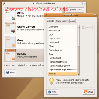 | Cambiamo il tema del Desktop: Vogliamo personalizzare icone, finestre e menu del nostro Desktop? Andiamo in Sistema > Preferenze> Aspetto > Tema. Da qui potremo scegliere uno dei temi disponibili o creare un nuovo tema completamente personalizzato! I risultati sono stupefacenti ed evidenziano la cura grafica riservata a ogni particolare. E se volessimo altri temi? Non si può che visitare gnome-look.org, una fonte ricchissima di temi, grafica ed effetti per il nostro Desktop! Trasciniamo alcune icone sul Desktop: Se usiamo spesso un’applicazione converrà portarne l’icona sul Desktop. Dal menu relativo, selezioniamo l’icona che desideriamo tenendo premuto il pulsante sinistro del mouse e trasciniamola sul Desktop o su una delle due barre ai margini dello schermo. Tre applicazioni spesso utilizzate sono certamente Computer presente nel menu Risorse, tramite il quale possiamo navigare tra file e cartelle; Terminale, la shell Linux, e infine Monitor di sistema, per vedere informazioni relative al nostro sistema, queste ultime due presenti nel menu Applicazioni > Accessori. PER APPROFONDIRE | ||