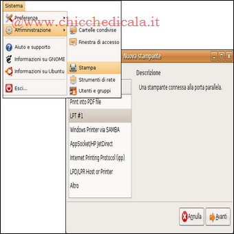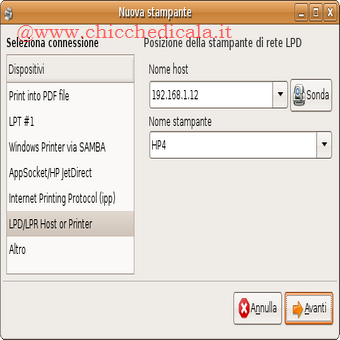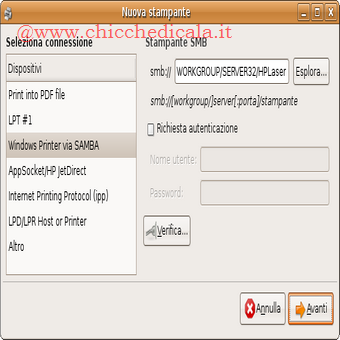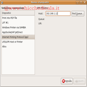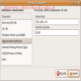 | Se abbiamo una stampante condivisa installata su un PC con Microsoft Windows scegliamo invece Windows Printer via Samba. Se abbiamo una stampante dotata di scheda di rete ethernet o collegata a un Print Server scegliamo l’opzione AppSocket/HPjetDirect e, assegnamo l’indirizzo di rete della stampante. | ||
