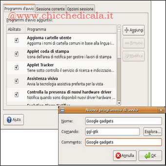 | Infine, perché il servizio di Google Gadgets si avvii ogni volta automaticamente, andiamo in Sistema > Preferenze > Sessioni > Programmi d’avvio. Premiano Aggiungi, diamo un nome al servizio e scriviamo < ggl-gtk > nel campo Comando. Google Gadget ora è parte integrante del Desktop di Ubuntu! | ||