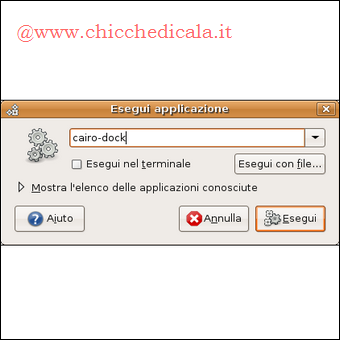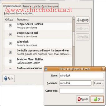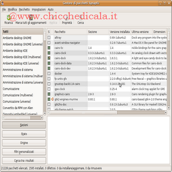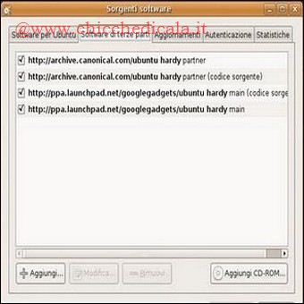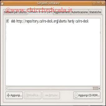 | Cairo-Dock: Per installare Cairo-Dock andiamo in \t\tSistema > Amministrazione > Sorgenti Software > Software di terze parti, premiamo il bottone Aggiungi ed inseriamo la seguente linea: deb http://repository.cairo-dock.org/ubuntu hardy cairo-dock Chiudiamo il pannello Sorgenti Software e ricarichiamo i pacchetti provenienti dal repository, premendo il bottone Ricarica. Ora andiamo in Sistema > Amministrazione > Gestore pacchetti Synaptic. | ||
