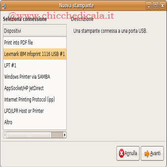 | Selezionato il tipo di collegamento, l’installazione procederà in modo pressoché automatico. L’utente dovrà limitarsi a scegliere il driver corretto per la propria stampante dal database fornito da Ubuntu o fornire il file PPD (nel caso di stampanti Postscript). Una volta trovati i driver, basterà infine passare di finestra in finestra in modo assolutamente intuitivo e la stampante verrà installata! Cerchiamo un aiuto in rete: Se anche seguendo queste procedure la nostra stampante non fosse correttamente riconosciuta? Niente paura, c’è Internet! Cerchiamo nel database di linuxprinting.org oppure nella pagina wiki.ubuntu maggiori informazioni riguardo la nostra stampante. Inoltre Se abbiamo una stampante che supporta il protocollo IPP scegliamo Internet Printing Protocol (ipp). Infine, se vogliamo utilizzare il servizio LPD non ci resta che selezionare LPD/LPR Host or Printer.PER APPROFONDIRE. | ||