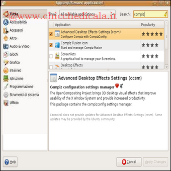 | Per abilitare un pannello ricco di altri effetti installiamo l’Advanced Desktop Effects Setting (ccsm). Andiamo nel menu Applicazioni > Aggiungi/Rimuovi, cerchiamo compiz, quindi spuntiamo il piccolo quadrato corrispondente al programma Advanced Desktop Effects Setting (ccsm). Ora clicchiamo il bottone Applica modifiche e attendiamo il completamento dell’installazione! E per chi avesse voluto effettuare l’installazione da shell? Andiamo in Applicazioni > Accessori > Terminale e scriviamo sudo apt-get install compizconfig-settings-manager, premiamo INVIO e l’installazione avrà inizio! | ||