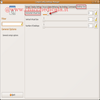 | Il cubo: Terminata l’installazione, andiamo in Sistema > Preferenze >Advanced Desktop Effects Settings e prepariamoci a vedere Compiz in azione! Gli effetti disponibili tramite Compiz sono moltissimi, ma certamente uno dei più spettacolari è il Desktop tridimensionale: il famoso cubo! Per prima cosa andiamo in General Options >Desktop Size e portiamo a 4 il valore di Horizontal Virtual Size. Torniamo nel menu iniziale premendo Indietro e andiamo nella categoria Desktop. | ||