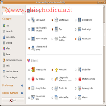EFFETTI SPECIALI CON COMPIZ FUSION!Finestre trasparenti, Desktop tridimensionale, ombre, animazioni, finestre elastiche, di cosa stiamo parlando? Questo è Compiz fusion, uno strumento che renderà il nostro Desktop ricco di fantastici effetti video! Abilitare gli effetti visivi predefiniti di Ubuntu è semplice. Andiamo in Sistema > Preferenze > Aspetto > Effetti visivi e selezioniamo la voce Aggiuntivi per abilitare effetti più avanzati. Questa semplice operazione renderà immediatamente visibili alcuni effetti davvero sorprendenti! Le finestre diventano elastiche e negli spostamenti si deformano, ma questo è solo l’inizio! | ||