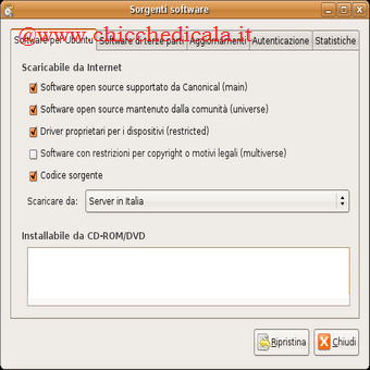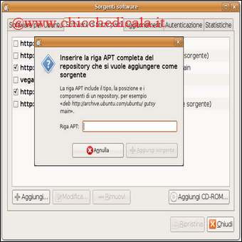 | Attiviamo i repository principali: Abbiamo visto quanto i repository siano importanti per prelevare aggiornamenti o nuovi software. Ora è necessario capire quali siano i repository abilitati nel nostro sistema o scoprire come aggiungerne altri. Aggiungere repository significa infatti avere accesso a una più vasta disponibilità di software! Andiamo in Sistema > Amministrazione > Sorgenti software. Nella scheda Software per Ubuntu è importante che siano spuntate le prime quattro opzioni: main, universe, restricted e multiverse. Se così non fosse, abilitiamole! In questo modo saremo certi di potere scaricare le molte applicazioni disponibili per Ubuntu! Aggiungiamo un repository: E se avessimo l’indirizzo di un particolare repository dal quale attingere altro software? Questa è una funzione importantissima e capita spesso di doverne fare uso! Nella scheda Software di terze parti, tramite il bottone Aggiungi, potremo inserire l’indirizzo di nuovi archivi software. E in un secondo momento, ad esempio tramite Synaptic, potremo prelevare le applicazioni che vi risiedono! | AGGIORNIAMO IL SISTEMA E LE IMPOSTAZIONI DI LINGUA:Aggiornare il sistema è importante e se disponiamo di una connessione veloce a Internet risulta essere una procedura estremamente rapida ed efficiente. La disponibilità di aggiornamenti di sistema è annunciata dall’icona arancione posta nell’area di notifica, nella parte superiore destra del Desktop. | |