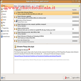 | Installazione dei codec multimediali: Anche per quanto riguarda l’installazione dei codec, Ubuntu ha cercato di facilitare l’utente il più possibile. Se infatti clicchiamo su un filmato e questo non dovesse avviarsi, Ubuntu ci comunica immediatamente che probabilmente manca il codec necessario e domanda se è possibile avviare una ricerca automatica. Nella maggior parte dei casi basterà permettere la ricerca perchè il codec venga trovato ed automaticamente installato! >PER APPROFONDIRE Ma se questo non dovesse accadere? O comunque volessimo installare personalmente i codec necessari? Per potere usufruire della maggior parte dei contenuti multimediali basterà andare nel pannello Applicazioni > Aggiungi/Rimuovi e installare i pacchetti GStreamer ffmpeg video plugin e GStreamer extra plugins. Questi due pacchetti ci permetteranno l’apertura dei più diffusi formati di file come mpeg, divx, mp3, wmv e molti altri! PER APPROFONDIRE | ||