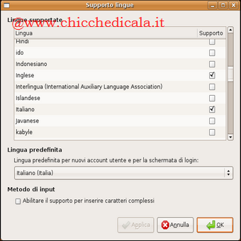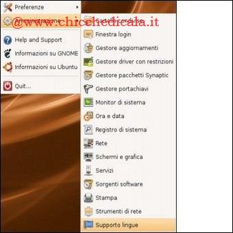 | Impostare la lingua di sistema: Oltre agli aggiornamenti di sistema, può accadere che qualche applicazione non sia in italiano o comunque nella lingua che \tintendiamo utilizzare. Per tradurre il Desktop di Ubuntu e le relative applicazioni \t\tnella lingua desiderata andiamo in Sistema > Amministrazione> Supporto lingue (System > Administration > Language support, nel caso il sistema fosse in inglese) > Entrando per la prima volta in questo pannello, il sistema chiede di installare il supporto per le lingue, accettiamo e attendiamo che l’installazione si completi. Terminata l’installazione, entriamo finalmente nel pannello di supporto lingue. Selezioniamo la lingua corretta e procediamo con l’aggiornamento. Al termine della procedura, riavviamo il sistema e avremo la lingua impostata correttamente! PER APPROFONDIRE | ||