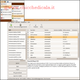 | Dopo aver scoperto la prima parte del desktop, oltre al pannello Aggiungi/Rimuovi, per installare nuovi programmi Ubuntu ci mette a disposizione il Gestore pacchetti Synaptic. Tramite Synaptic potremo cercare, installare o rimuovere tutto il software che desideriamo. È un applicativo estremamente efficiente, implementato in genere sulle distribuzioni derivate da Debian. | ||