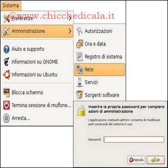 | Configurazione di rete In Ubuntu: il pannello che gestisce la connessione a Internet si trova in Sistema > Amministrazione > Rete. Se richiesto inseriamo la password di amministrazione. Qui abbiamo la possibilità di configurare sia la connessione wireless,sia la connessione cablata (ethernet), sia la connessione punto a punto tramite Modem. Tramite questo pannello e il browser web potremo in sostanza configurare ogni tipologia di connessione. | ||