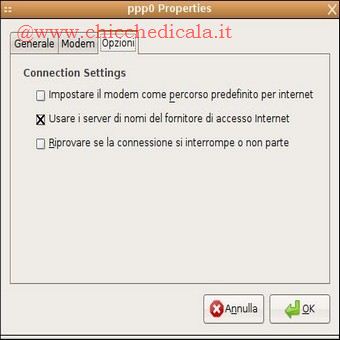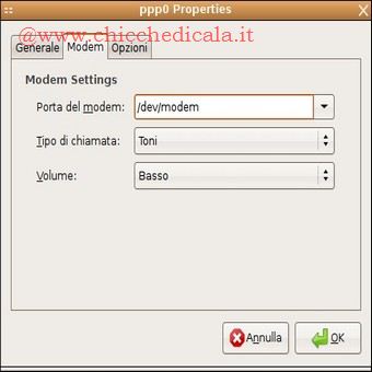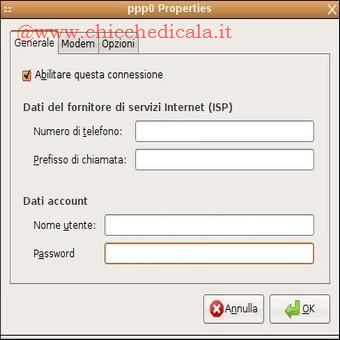| Nel tab Generale inseriamo utente e password forniti dal tuo ISP al momento della registrazione ed il relativo numero telefonico. Tali informazioni le troverai di sicuro sul sito del tuo gestore internet. Nel nel tab Modem dobbiamo solamente verificare che sia presente il modem installato sul pc. Se abbiamo un modem seriale, devi verificare che sia selezionata la porta seriale a cui è collegato, (ad esempio /dev/ttyS0). | ||