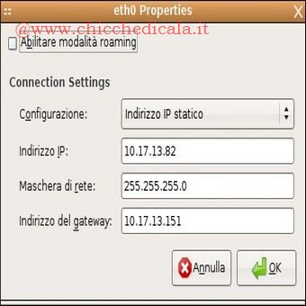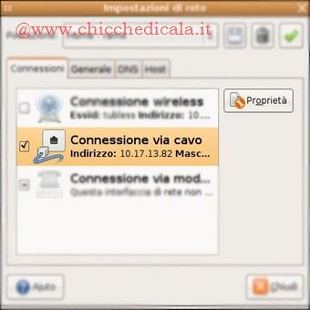 | Configurare connessione via cavo: Spuntiamo la voce Connessione via cavo e premiamo il pulsante proprietà. Si aprirà la finestra nella quale dovrai inserire i dati richiesti: In maschera di rete, potete inserire 255.255.255.0 Per venire a conoscenza dell’ indirizzo gateway e IP basterà aprire il terminale e digitare sudo ipconfig. | ||