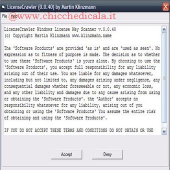 | 1. Portiamoci al seguente indirizzo e procediamo con lo scaricamento di License Crawler, lanciamo l’exe e accettiamo i termini di licenza cliccando su Accept. 2. Successivamente clicchiamo su StartSearch, in pochi minuti visualizzerete tutti i seriali presenti sul vostro PC, con la possibilità di salvataggio criptato. | ||
