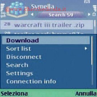 | 3. Dopo aver effettuato la connessione andiamo nel menu Opzioni/Search. Nel campo Search for scriviamo il nome del file da cercare e clicchiamo su OK. Dopo alcuni secondi avremo un elenco dei risultati della ricerca. Per avviare il download è sufficiente selezionare il file e andare in Opzioni/Download. | 4. Affinché il download venga avviato, occorre attendere un po’ di tempo, anche diversi minuti. Al termine dello scaricamento, invece, il file sarà salvato nella cartella Downloads presente nella directory principale della memoria del telefonino. È possibile modificare questa preferenza andando in Opzioni/Settings. | |
