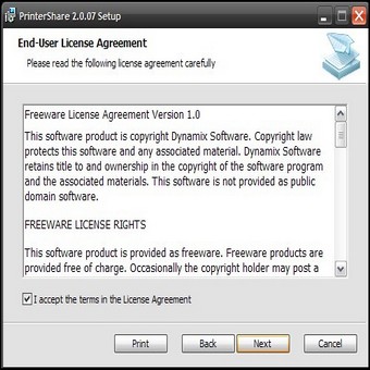 | 1. Avviamo l’installazione del programma e mettiamo un segno di spunta alla voce I accept the terms in the License Agreement. Clicchiamo su Install per proseguire. Al termine clicchiamo su Next, mettiamo un segno di spunta accanto alla voce Start PrinterShare Console ed infine premiamo Finish. Ecco davanti a noi la schermata di registrazione. | 2. Inseriamo i nostri dati personali (in particolare è obbligatorio inserire un nickname, ad esempio Matrix, nel box User ID e l’indirizzo di posta elettronica in E-mail cliccando su Create New Account. Siamo finalmente di fronte all’interfaccia principale del programma. Da qui possiamo condividere le nostre stampanti con altri o stampare su quelle dei nostri amici. | |
