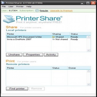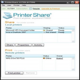 | 3. Nella sezione Local Printers sono elencate tutte le stampanti installate sul nostro PC. Selezioniamone una e clicchiamo sul pulsante Share. Se abbiamo compiuto tutta la procedura nel modo corretto, nella seconda colonna, quella con l’intestazione Sharing, apparirà la voce Shared. Ripetiamo i passi per tutte le stampanti che desideriamo utilizzare. | 4. Supponiamo di essere un nostro collega (anch’esso registrato con PrinterShare) che vuole inviarci un documento sulla stampante appena condivisa da Matrix. Nella schermata principale, clicchiamo sul pulsante Find printer per cercare una stampante remota. | |