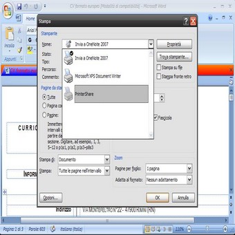 | 5. Per vedere solo le stampanti condivise da Matrix, è necessario inserire tale nickname nella barra di ricerca, posta nella parte superiore dello schermo, premendo Find al termine. Dopo alcuni secondi, comparirà la lista delle stampanti condivise da utenti il cui nickname contiene la parola Matrix. Selezioniamo quello corretto dall’elenco e clicchiamo su OK. | 6. Ora possiamo aprire un documento qualsiasi da stampare, ad esempio due file Word. Una volta aperto il file, da Word stesso avviamo la stampa, scegliamo come stampante quella (virtuale) denominata Printershare e premiamo OK. Apparirà una nuova finestra: dalla casella Printer, selezioniamo la giusta stampante tra quelle prima condivise da Matrix, diamo OK e il gioco è fatto! | |