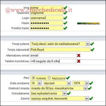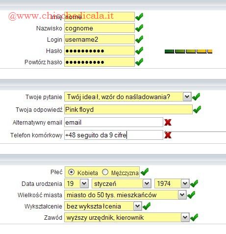 | 1. Portiamoci al seguente indirizzo (link alternativo:https://profil.wp.pl/rejestracja.html?idu=64&serwis=&url= ) e compiliamo i campi richiesti. (per dettagli vedi punto3 metodo1). | 2. Portiamoci al seguente indirizzo (link alternativo: http://profil.wp.pl/index2.html?idu=64 ) e inseriamo i dati utilizzati per la registrazione al punto 1. | |