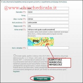 | 5. Saremo indirizzati nuovamente su un altro Form, compiliamo i campi richiesti; Indirizzo, Codice Postale, Città ed indirizzo E-Mail usato in precedenza (lista indirizzi polacchi). Compiliamo il codice Captcha rispettando Maiuscole/Minuscole e clicchiamo su Przejdz dalej | 6. La pagina successiva ci indicherà la spedizione al nostro \tindirizzo del codice promozionale. Dopo pochi istanti riceveremo una E-Mail con oggetto Antywirus - jak pobrac program contenente il nostro codice Promo. | |