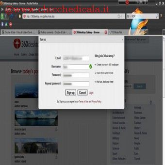 | 3. Clicchiamo con il mouse sull’icona presente nella taskbar e selezioniamo la voce 360 Manager, che ci permette di gestire tutti gli sfondi caricati nel programma. Per cambiare quello presente sul desktop, basta spostare il mouse su quello desiderato e cliccare sull’occhio verde all’apparire della voce Show. | 4. Per creare uno sfondo a 360° dobbiamo collegarci sul sito 360desktop.com ed entrare nella sezione Create 360’s. Iniziamo la procedura di registrazione cliccando su Sign up now!, in alto a destra, e nella nuova finestra inseriamo indirizzo e-mail valido, username e password. Proseguiamo su Sign-Up. | |