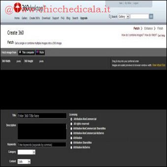 | 5. Dopo il messaggio di avvenuta registrazione, inseriamo i nostri dati nei campi Username e Password e clicchiamo su Login. Una volta loggati, ritorniamo nella sezione Create 360’s. Nella nuova finestra, per caricare una foto, clicchiamo su This computer, a destra della voce Fetch image from. | 6. Andiamo su Browse select images, scegliamo una foto, la evidenziamo con un clic del mouse e premiamo Apri. Selezioniamo Upload images per caricarla sul sito e, all’apparire del messaggio Upload complete!, clicchiamo in basso a sinistra Add images to Canvas. | |