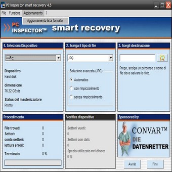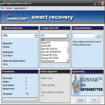 | PC INSPECTOR smart recovery è al momento uno dei programmi di recupero dati per Flash Card, Smart Media, SONY Memory Stick, IBM Micro Drive, Multimedia Card, Secure Digital Card e per tutti gli altri supporti di memorizzazione dati per fotocamere digitali. Se avete cancellato immagini, files video o audio dal supporto, formattato o estratto il supporto durante l’accesso per la scrittura, PC INSPECTOR smart recovery ricostruisce da solo i dati in modo veloce, semplice e del tutto sicuro. Il software è di semplicissima applicazione. e può essere eseguito su tutti i sistemi Win 9x, ME, NT 4.0, XP e Windows 2000. | ||