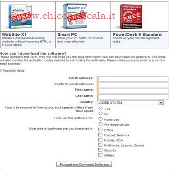 | 1. Portiamoci al seguente pagina promozionale, compiliamo i campi richiesti e clicchiamo su Proceed and Download Software. | 2. Nella pagina successiva potremo direttamente scaricare Web Site X1. (Potete installarlo senza bisogno di una chiave di licenza) | |