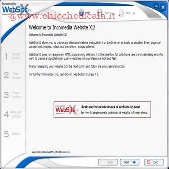 | 3. Installiamo ed avviamo Incomedia WebSite X1 (wsx1_it.exe). Sulla sinistra della schermata principale vedremo le 5 fasi della creazione del sito. Clicchiamo Next per iniziare a definire le Impostazioni generali. Ricordiamoci che in ogni momento, in caso di difficoltà, possiamo premere il tasto F1 per accedere alla guida del programma. | 4. La schermata successiva riporta una doppia opzione che permette di scegliere se realizzare un nuovo progetto o modificarne uno già creato. Poiché questo è il nostro primo sito, selezioniamo la voce Create a New Project e clicchiamo Next. Compiliamo tutti i campi del modulo che appare e proseguiamo con un clic su Next. | |