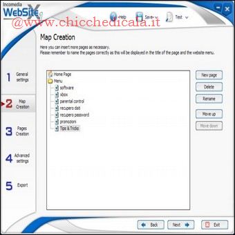 | 5. Nella pagina che si apre, scegliamo il tipo di menu che vogliamo applicare al sito, nel mio caso Vertical Menu, e procediamo con Next. Clicchiamo sui temi presenti a sinistra della schermata. Potremo così visualizzarne l’anteprima sulla destra e, quando avremo trovato uno stile di nostro gradimento, confermiamolo con Next. | 6. È il momento di aggiungere (tasto New Page) tante pagine quante sono le sezioni che vogliamo far comparire nel menu principale del sito. Possiamo rinominarle in qualsiasi momento (Rename) o cambiarne l’ordine con i tasti Move Up e Move Down. Una volta inseriti i nominativi delle pagine, premiamo Next. | |